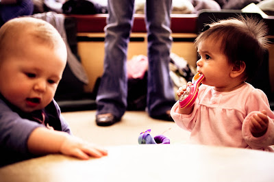 We went to Day One's music class for babies today with Linsey & Barrett and CC & Henry. We met a couple of my friends from Tatum's playgroup - Ashley & Kim, there as well. It was so much fun! Tatum really enjoyed the music teacher playing his guitar. All the kiddos had a lot of fun beating on the drum and trying to steal the sheet music. This was my first "class" that I took Tatum to on her own. As the second child she is always being toted to Landon's events and gets to participate by default. I was excited to take her to a class where it was all about her having fun. After class, the six of us went out for a little "ladies who lunch with their babies" lunch at The Magic Flute. Please excuse the graininess of the first set of pictures. I for some reason had my ISO at 1600!!! UGH!